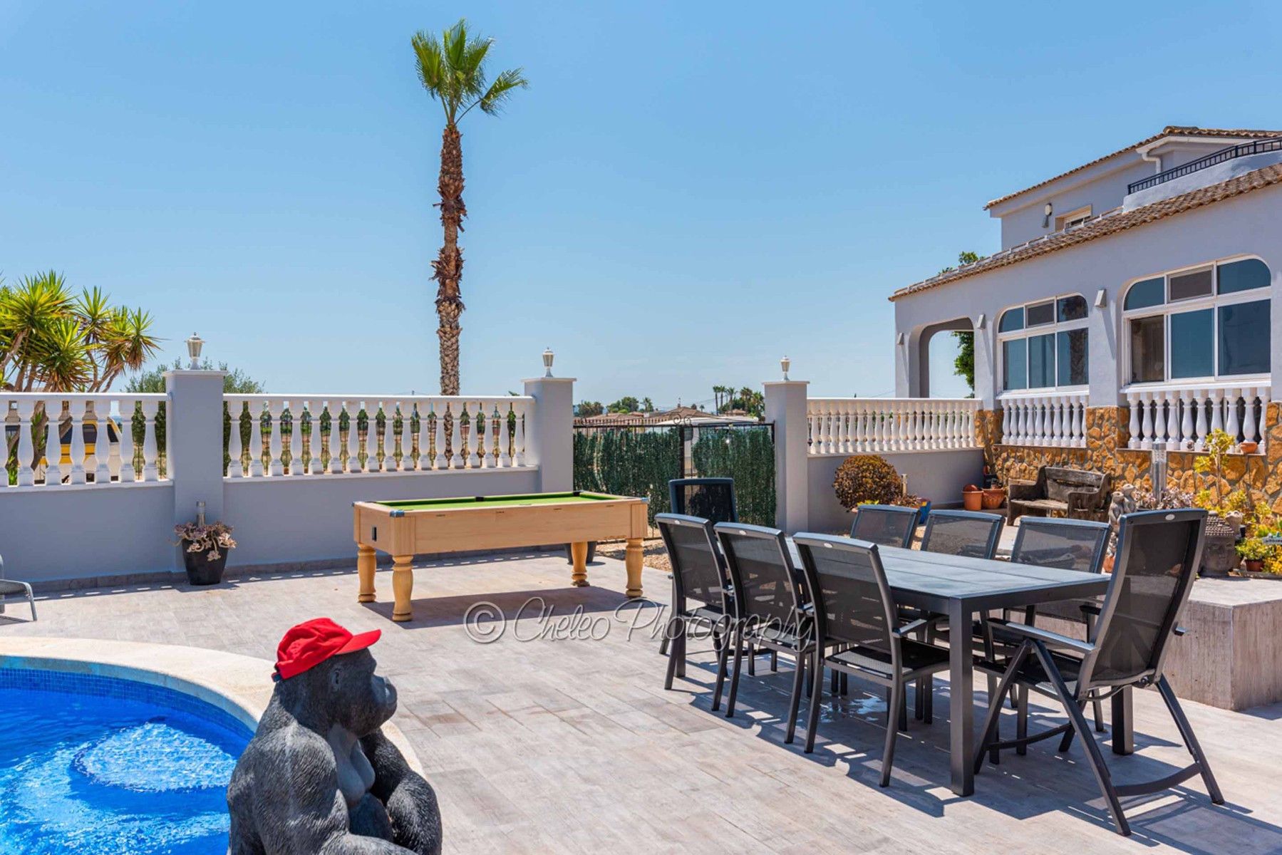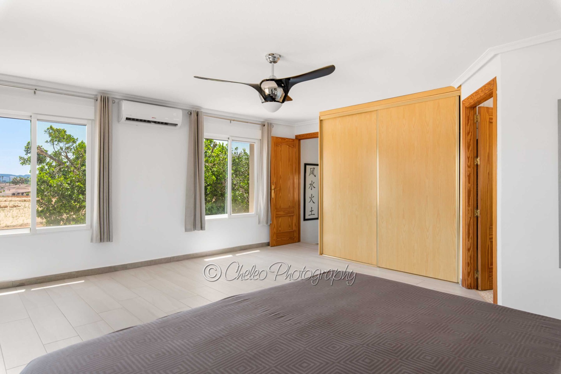 Stunning Detached Villa with Pool and Guest Apartment near Catral This beautifully presented detached villa boasts a generous 540m² build size*, set on a spacious 5,400m² plot*, just minutes from the charming town of Catral. Set over three floors, the property offers a luxurious blend of space, comfort, and versatility—ideal as a family home, holiday retreat, or investment opportunity. Main Living Area: Open-plan lounge and modern fitted kitchen with separate utility room Fully glazed porch and dedicated dining room Master bedroom with fitted wardrobes and a stylish en-suite bathroom Additional double bedroom with walk-in wardrobe Contemporary family shower room Upper Floor: Large double bedroom with fitted wardrobes and en-suite shower room Access to a rooftop solarium with open views Additional Features: Air conditioning and ceiling fans installed in every room Mains water, electricity, and fiber optic internet connected Large 160m² underbuild* offering potential for a 3-bedroom self-contained apartment (requires finishing) Outdoor Space: Expansive sunbathing and entertaining terrace Attractive 10m x 5m kidney-shaped swimming pool Poolside bar and seating areas—ideal for hosting Self-contained guest apartment with: Lounge and open-plan kitchen Double bedroom Shower room and separate WC Location: Just 6 minutes from the town of Catral 3 minutes to local amenities 20 minutes to the nearest beaches 30 minutes to Alicante Airport *Approximate figures The information provided is intended as a general guide only and does not constitute a comprehensive statement of facts or legal details regarding the properties offered for sale. It is the sole responsibility of the purchaser and their legal representative to verify all details and establish the legal status of any property prior to completion at the notary. For regular updates on similar properties, please follow us on Facebook.