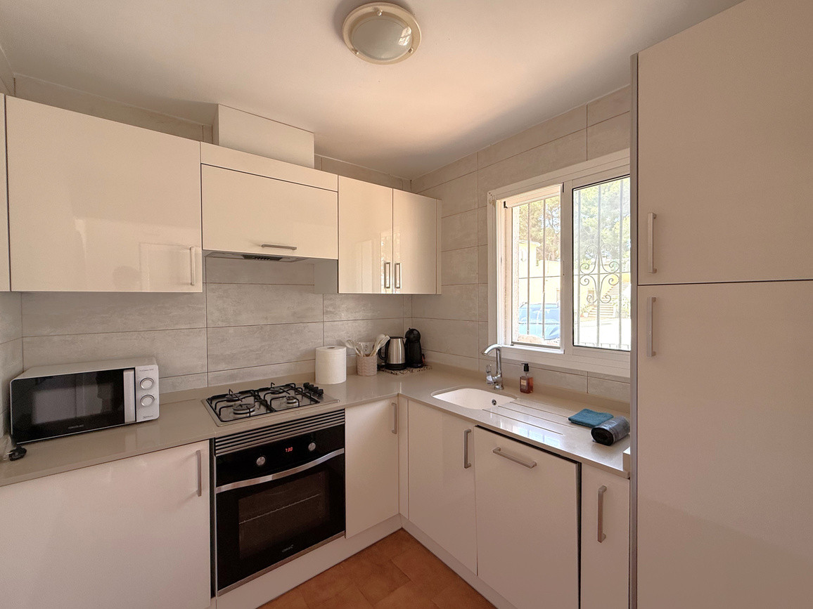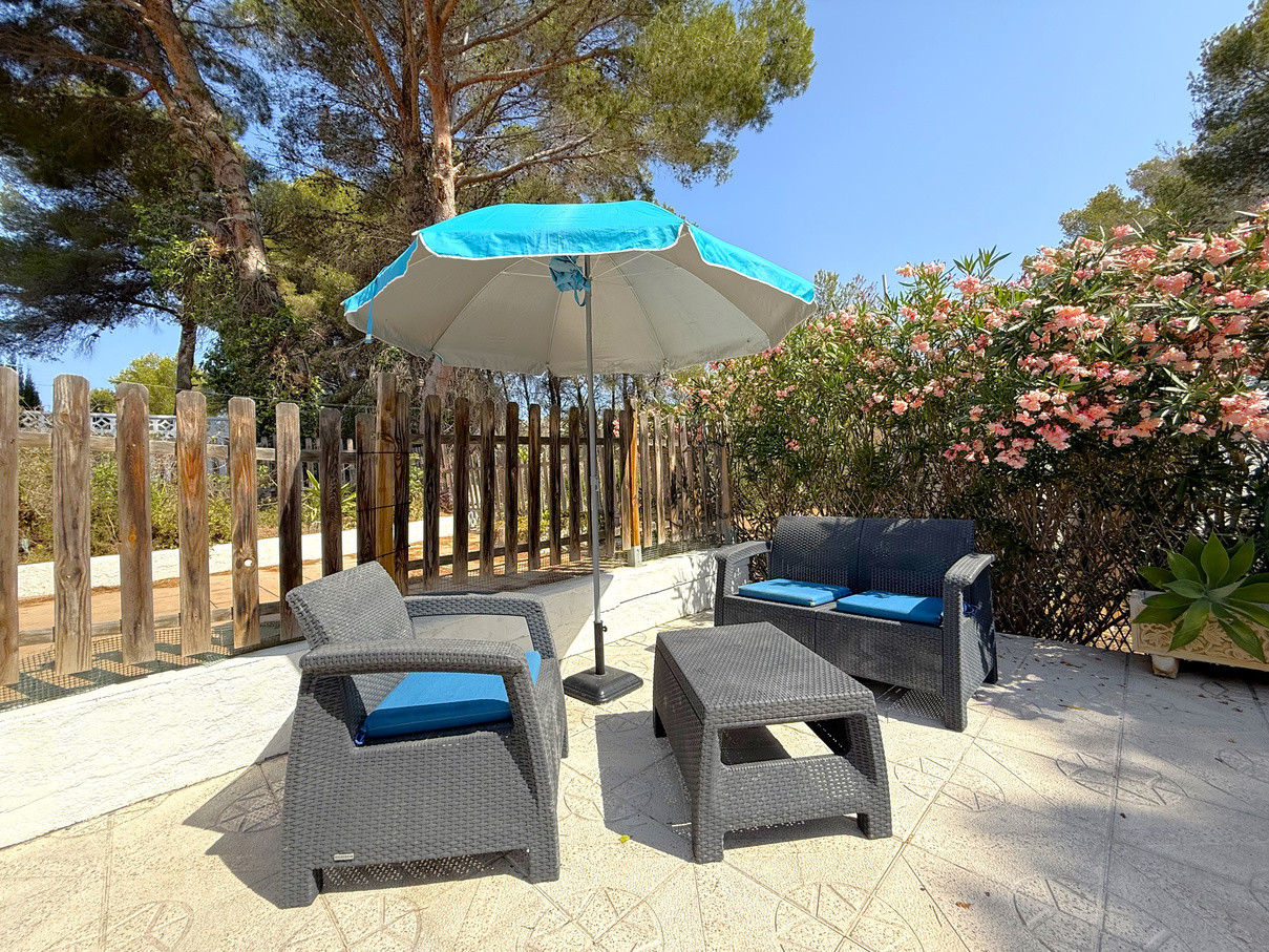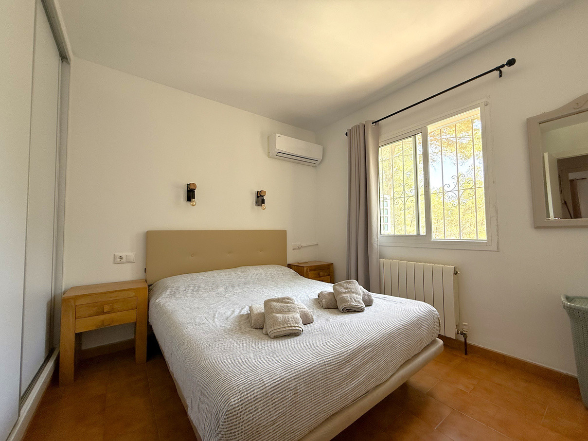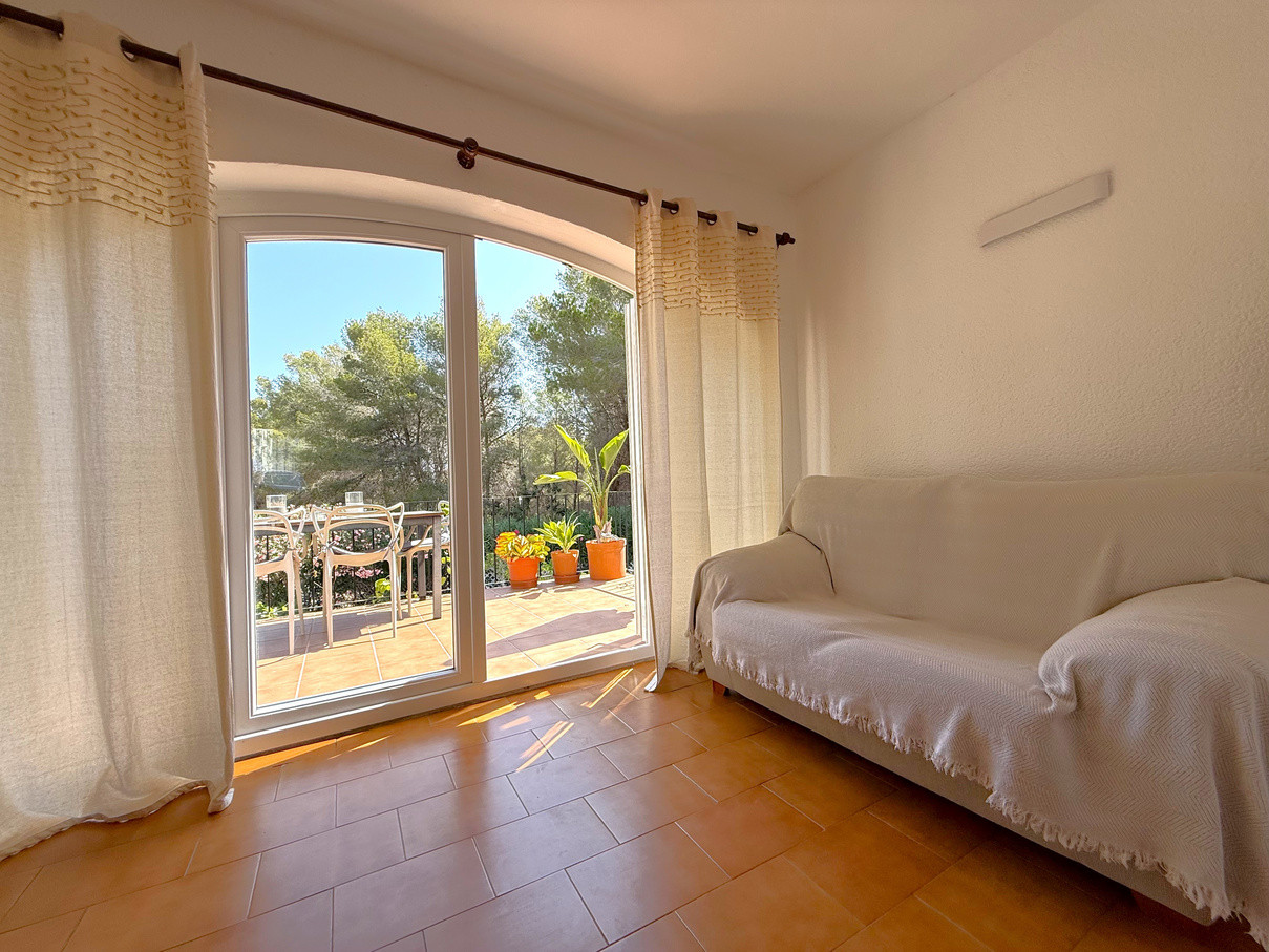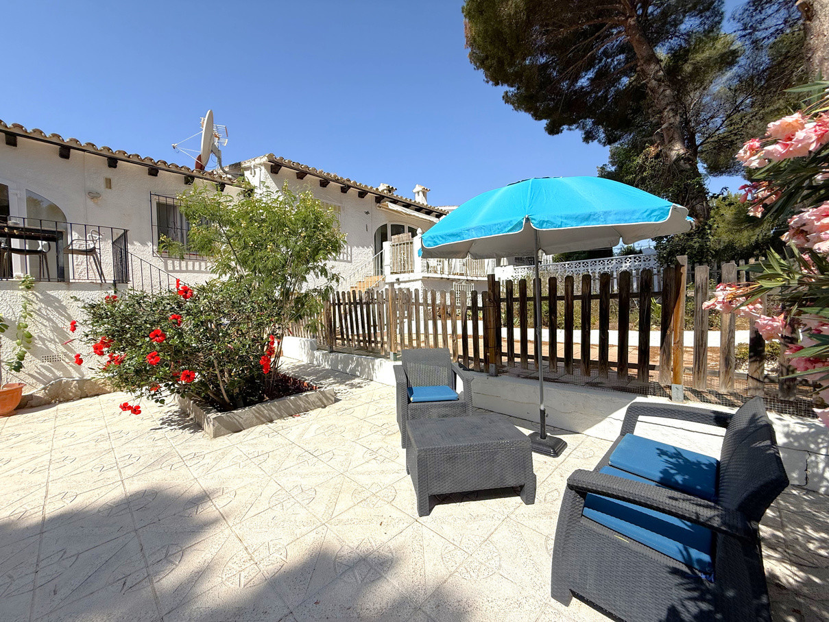 Cozy bungalow in a charming community with swimming pool in Moraira. Upon entering, you will find the independent kitchen to the right, followed by a bright living room with fireplace and dining area. To the left, there are two bedrooms and a full bathroom. From the living room, patio doors open onto a terrace with an outdoor dining space and, going down a few steps, to a spacious terrace ideal for enjoying the open air. At the front, the property also offers another terrace and convenient off-road parking. The bungalow is equipped with hot and cold air conditioning as well as heating. Community fees are 600 per year. A perfect choice as a holiday home, permanent residence, or investment with excellent rental potential.