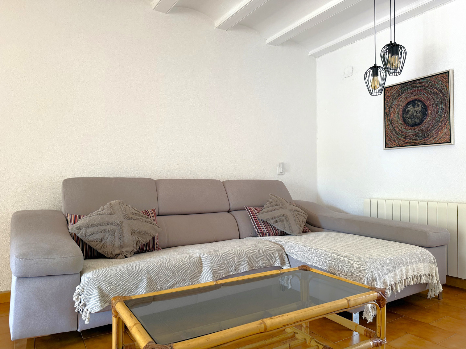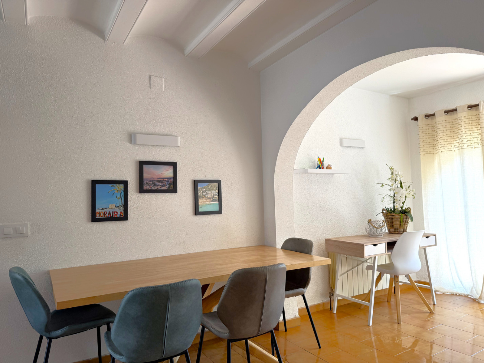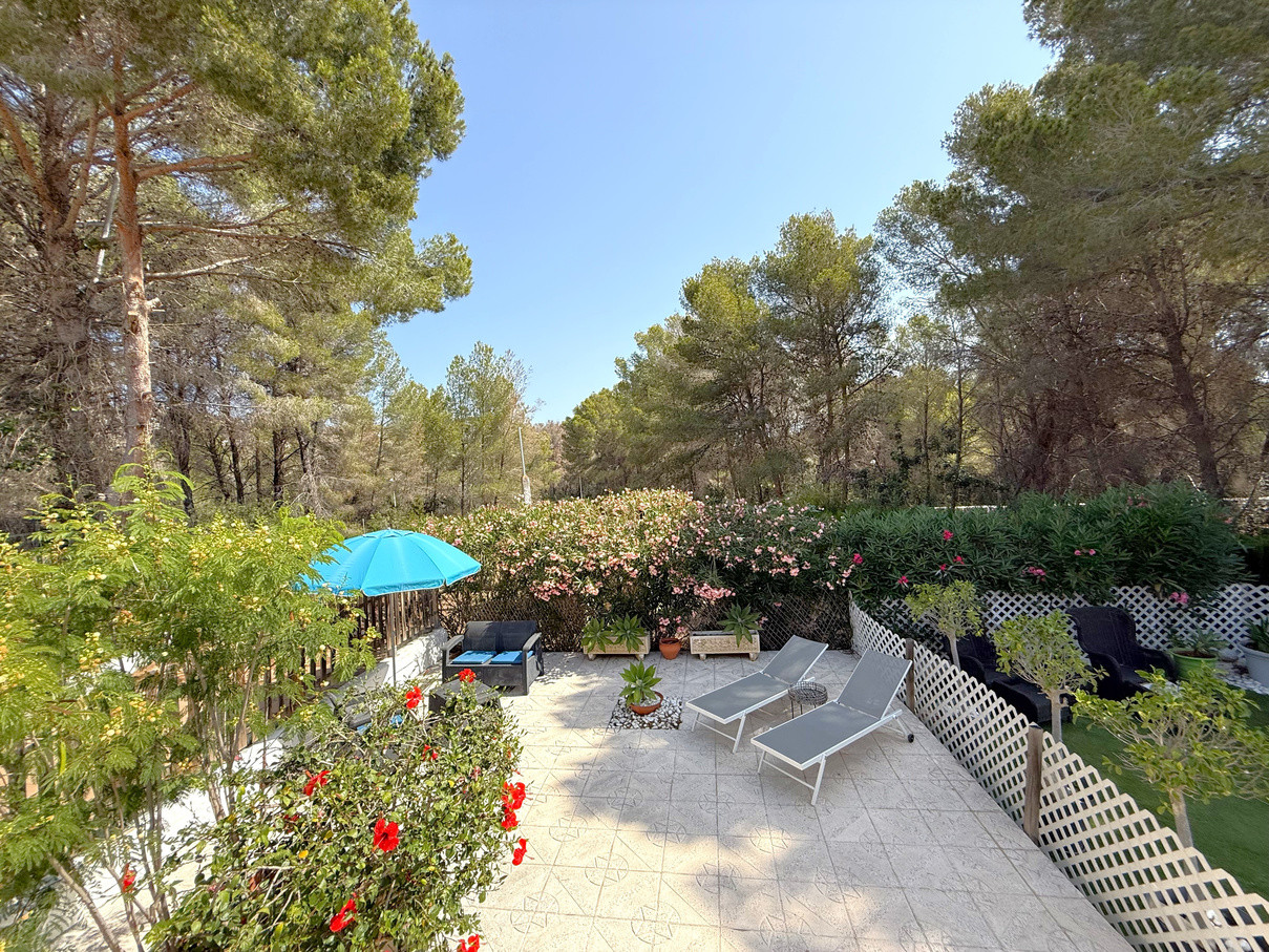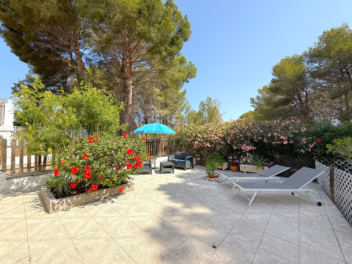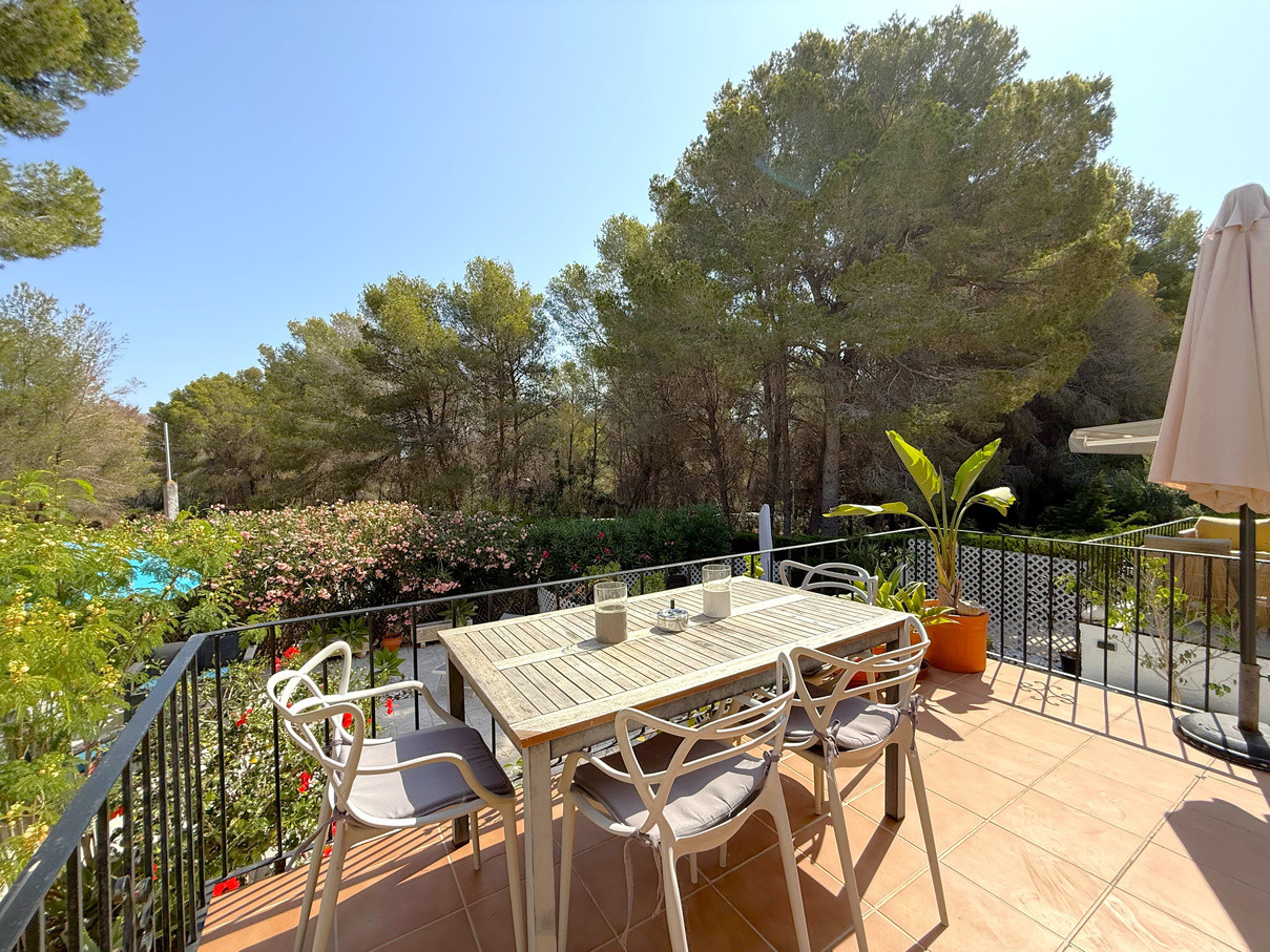 Cozy bungalow in a charming community with swimming pool in Moraira. Upon entering, you will find the independent kitchen to the right, followed by a bright living room with fireplace and dining area. To the left, there are two bedrooms and a full bathroom. From the living room, patio doors open onto a terrace with an outdoor dining space and, going down a few steps, to a spacious terrace ideal for enjoying the open air. At the front, the property also offers another terrace and convenient off-road parking. The bungalow is equipped with hot and cold air conditioning as well as heating. Community fees are 600 per year. A perfect choice as a holiday home, permanent residence, or investment with excellent rental potential.