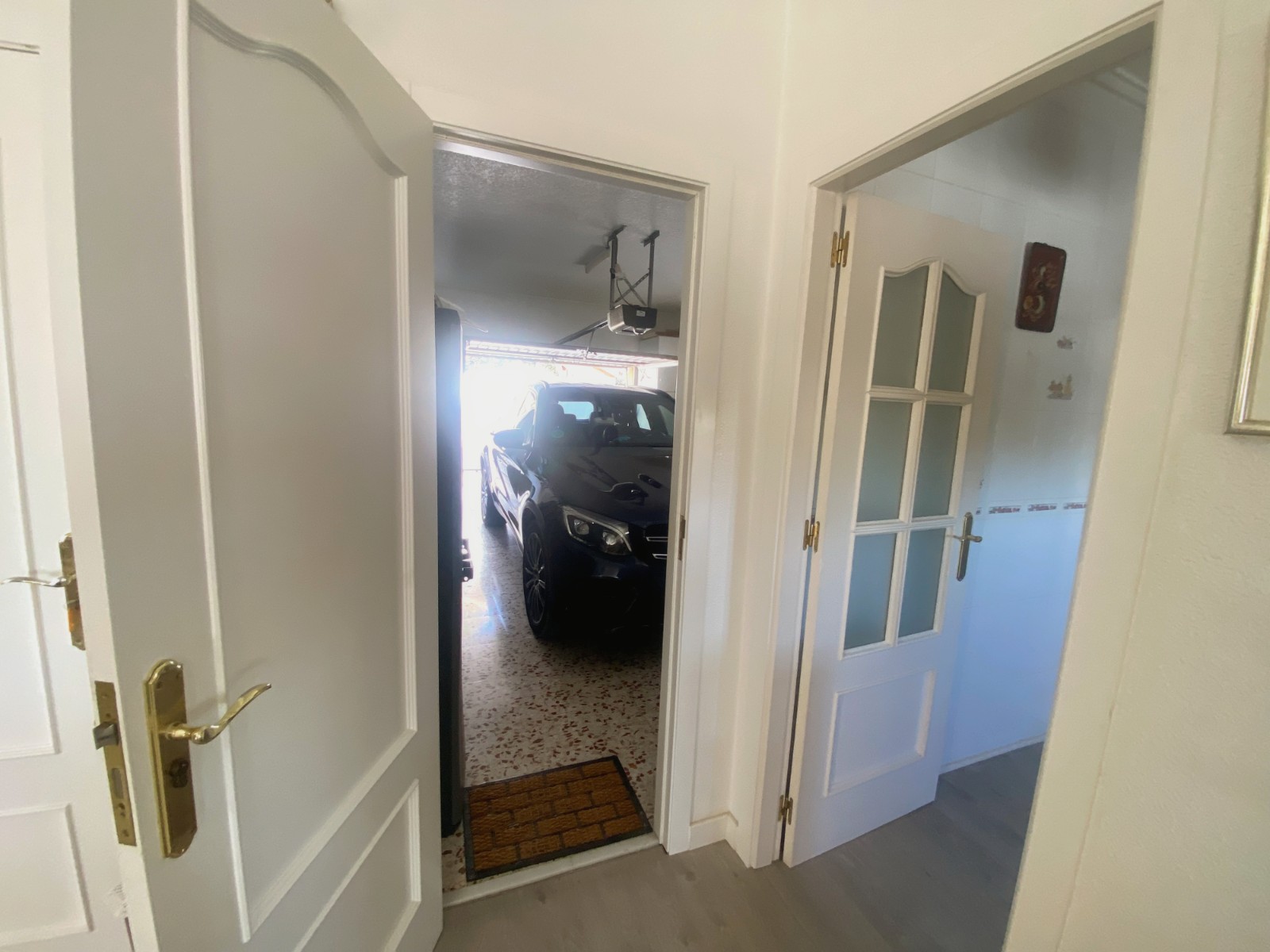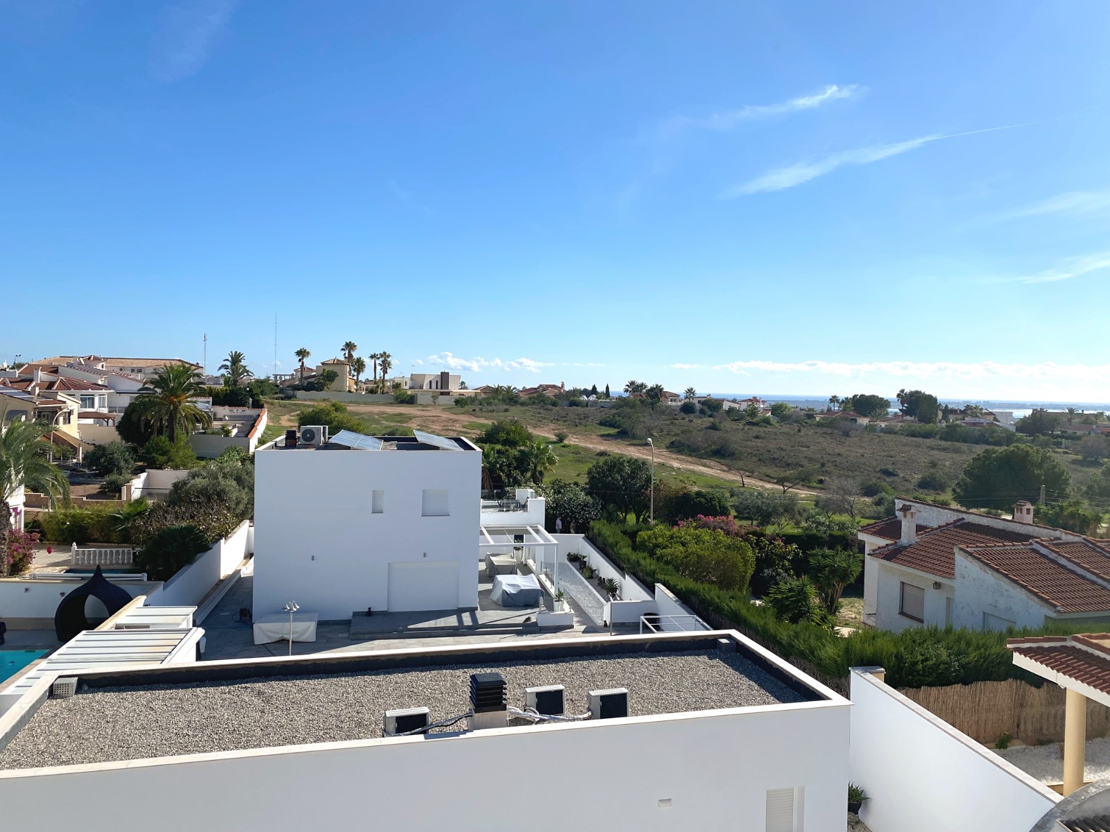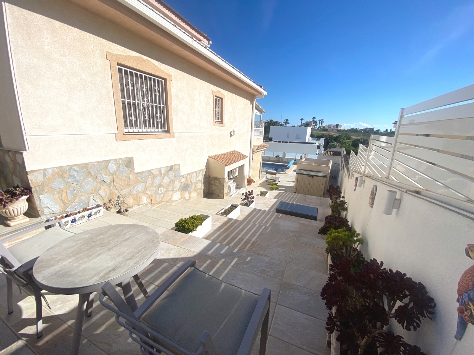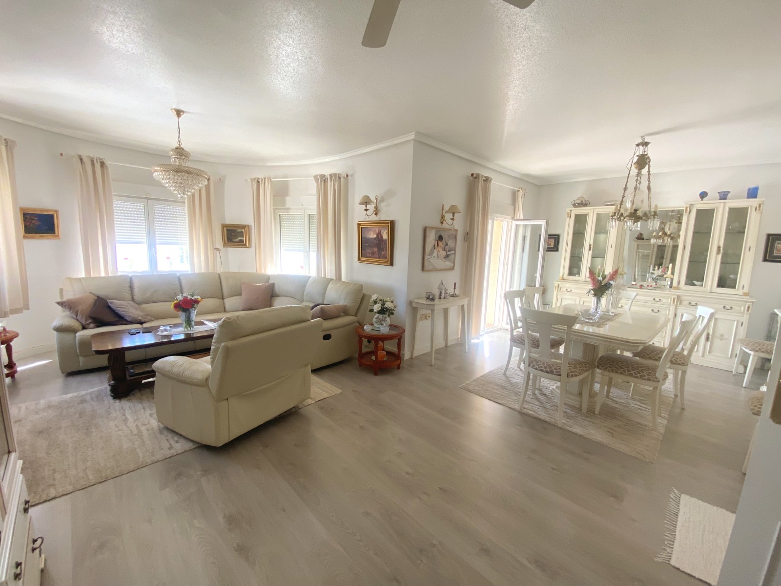 A large detached villa is presented for sale in excellent condition and has been maintained to a very high standard. The property offers a 3 bedroom, 3 bathroom villa distributed over three levels, all above ground due to the elevation of this large plot. Entrance to the villa, at road level, is the middle floor of this property and the entrance door opens into a large feature entrance hall with a staircase leading to the upper floor and a door that opens into a hallway and a very large living room with a designated dining area. Large windows in the lounge flood the living area with natural light giving a bright warm feeling throughout. Patio doors from the dining area open into a lovely glazed, glass curtain terrace currently used as a sunny seating area taking full advantage of its south facing aspect and has stunning views over private pool area, Quesada and to the salt lakes. Another door from the lounge area opens into a separate, classic fully equipped kitchen with ample work space and fitted units. Also, on this level and accessed from the entrance hall is a large double bedroom and a family size bathroom. Two additional doors adjacent to the hall way allow access to a large integral garage and a staircase that leads down to the lower level. The staircase in the main entrance leads up to a master bedroom suite complete with ensuite bathroom and walk-in closet. Patio doors from this suite open onto a large curved sun terrace with exceptional views to the lakes and park area. The staircase from the lounge door leads down to the lower level that is a full self- contained apartment complete with lounge, kitchen diner, a double bedroom, large bathroom and storage areas. Large windows and glazed doors give ample natural light to this entire area. The doors from this lounge area open onto a very large private pool and terrace area. Part glazed wall enhances this space for relaxation and entertaining. Ample terrace space around the pool for sun loungers, tables etc complete with a games area and pool table. Set back from the pool and under the Middle floor terrace is a fantastic covered seating area for the long evenings and ideal for entertaining. Awnings all round compliment this area perfectly. Viewing is highly recommended as there is so much on offer with this property Numerous extras just add to the attraction to this villa including air con throughout, underfloor heating in all bathrooms, electric solar panels, water filter system and heated swimming pool.