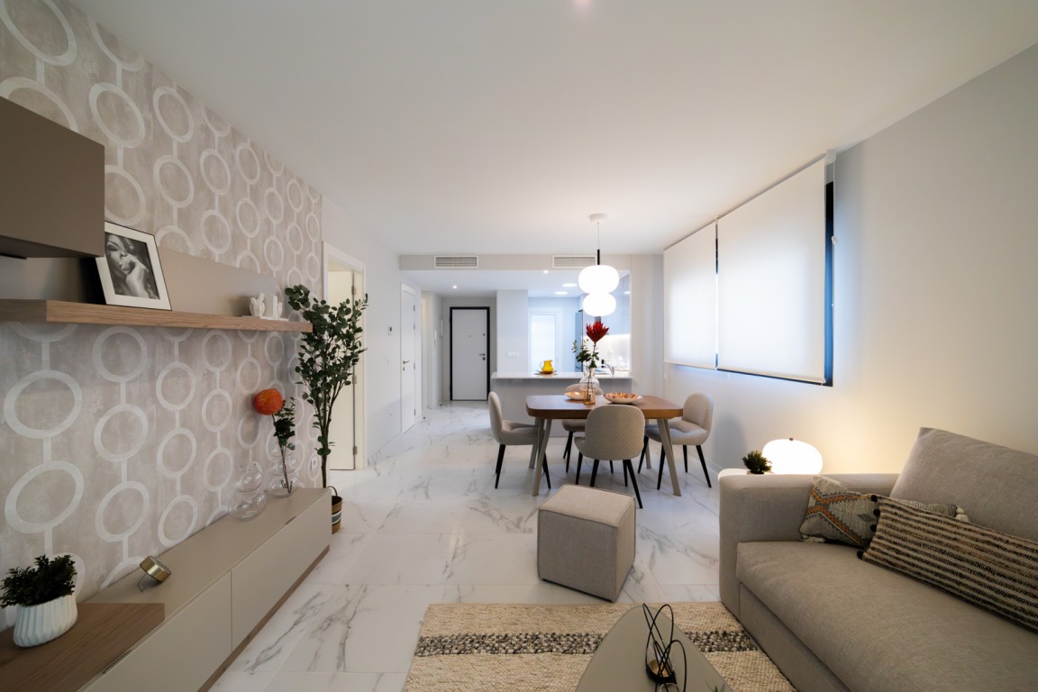 Appartementen met uitstekende gemeenschappelijke ruimtes in Playa Flamenca, Orihuela Costa. 2 en 3 slaapkamer strandappartementen op slechts 350 meter van het winkelcentrum Zenia Boulevard. Flamenca Village Phase 4 is een unieke woonwijk in Orihuela Costa en is gelegen op een uitstekende locatie. Deze nieuwe fase zal in totaal 124 appartementen hebben met 2 en 3 slaapkamers met een parkeerplaats met of zonder berging inbegrepen in de prijs, afhankelijk van de tipologie. De meer dan 17.000 meter aan gemeenschappelijke ruimtes laten u genieten van ongelooflijke voorzieningen, waaronder: een verwarmd buitenzwembad, jacuzzi's, zwembaden voor volwassenen, kinderbaden, een watergebied voor kinderen en een chill-out loungeruimte. Daarnaast heeft u ook toegang tot de met glas omsloten sportschool met panoramisch uitzicht over het meer met een fitnessruimte en een Finse sauna.
