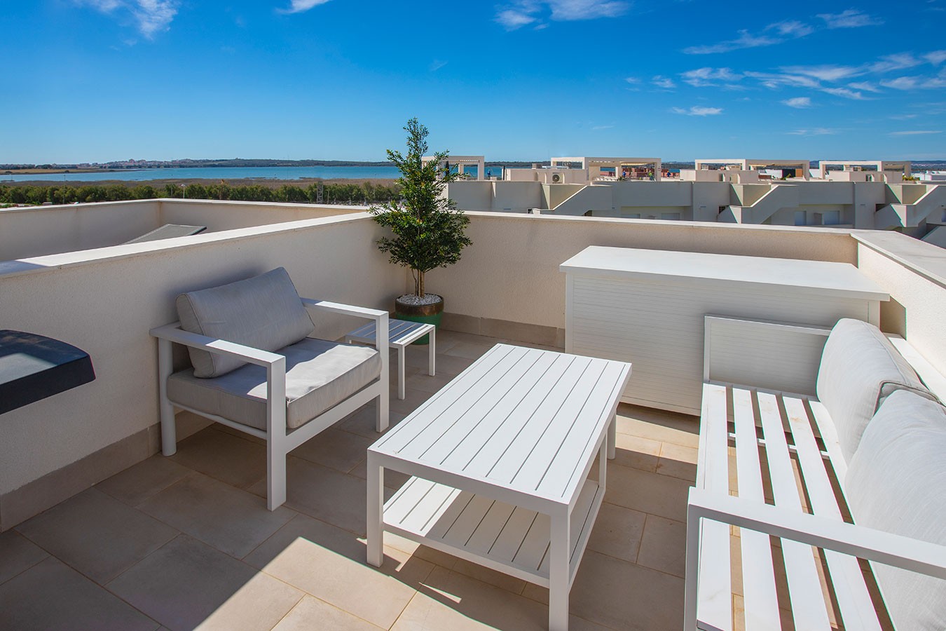 Het grote dakterras is een ware eyecatcher: hier geniet u van de zon, een prachtig uitzicht over het zoutmeer van La Mata en ultieme ontspanning in uw privéjacuzzi. Perfect voor zomerse dagen, gezellige avonden of een moment van pure rust onder de sterren.